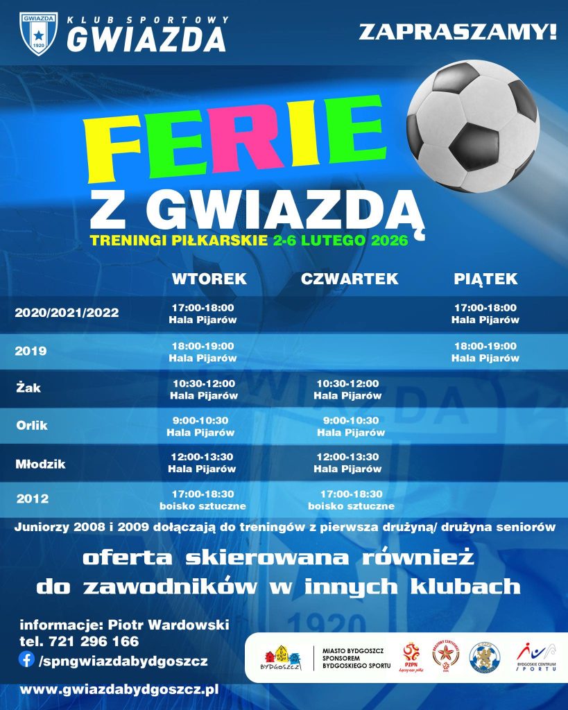 Klub Sportowy Gwiazda Bydgoszcz zaprasza dzieci i młodzież do udziału w akcji „Ferie z Gwiazdą”, skierowanej do wszystkich, którzy pierwszy tydzień ferii zimowych spędzają w Bydgoszczy lub przyjechali do naszego miasta na wypoczynek.